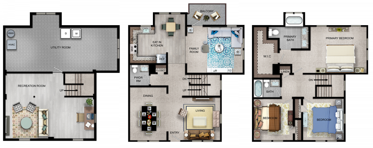 Each townhome and apartment rental feature a private entrance, fully equipped eat-in kitchen with dishwasher and microwave,central heating and air conditioning, wall to wall carpeting, walk-in closets,washer and dryer, and balcony. All apartments include private on-site parking with select rentals available with a basement that includes an unfinished extra storage space and a finished recreation room. Residents with children enjoy access to the on-site playground.
