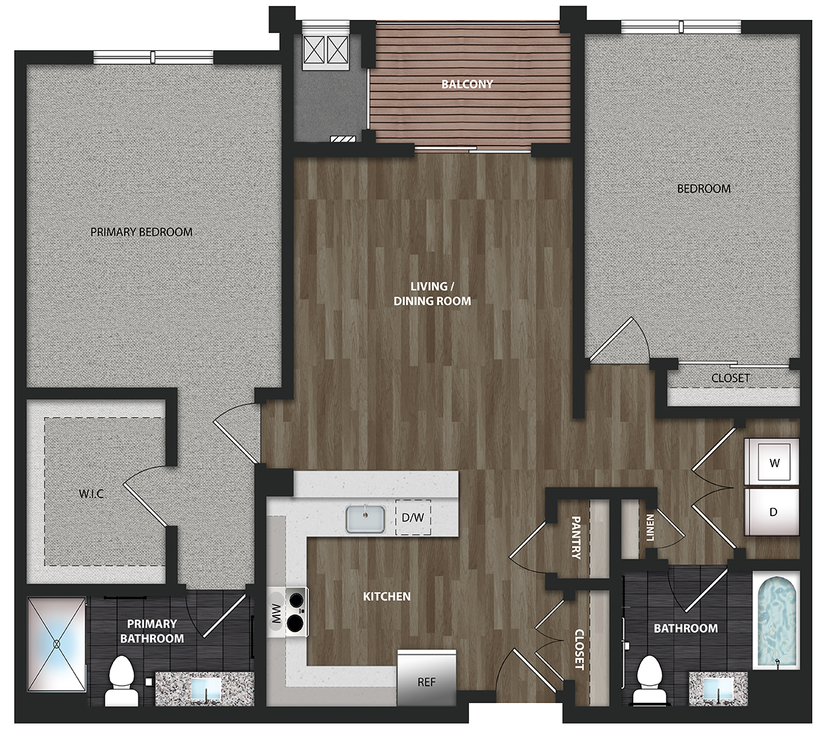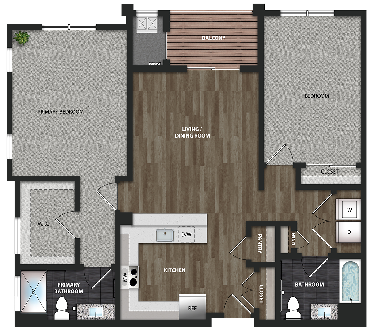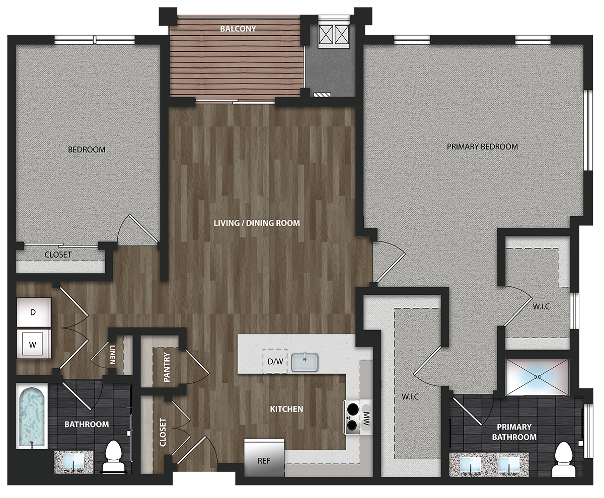 Our fitness center, walking paths, putting green, and outdoor fitness stations and bike racks make it easy for you to stay fit. EV charging stations and smart entry access are just a few of our modern conveniences. Be the first to live in your new home which features a full-size washer/dryer, large kitchen with quartz countertops and GE Slate Steel appliances, and wood-style floors in the living areas. Schedule a tour today!