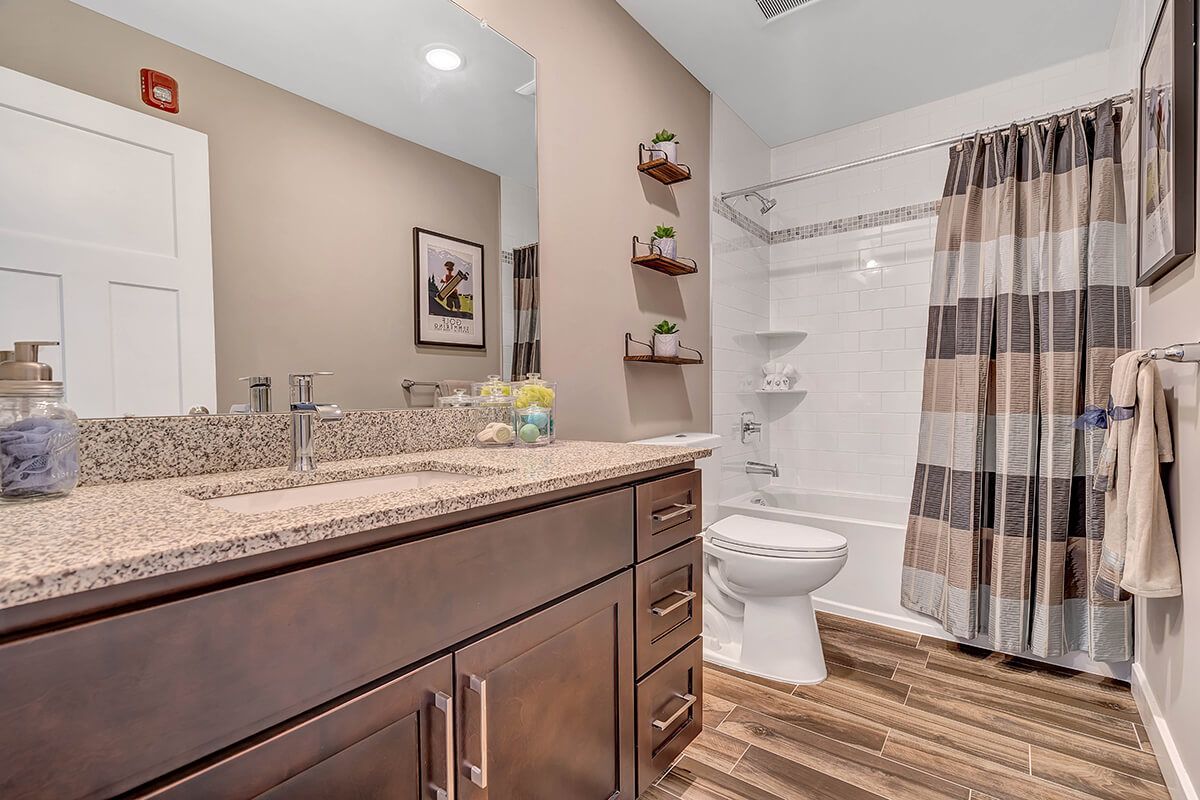 - Luxury baths with granite counters, and tiled floors and shower walls