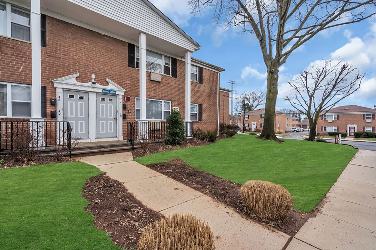 Cloverleaf Gardens photo of the exterior shows a brick building with white trim and red front doors. There is a circular walk way with straight sidewalks leading to each front door. Green Grass and bushes and trees are throughout the area.