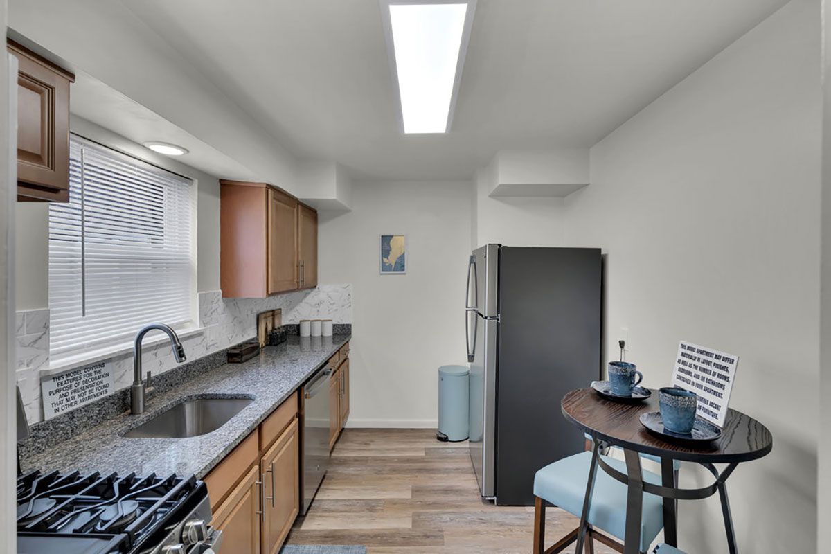 Cloverleaf Gardens photo shows the kitchen in a refurbished apartment with luxury vinyl tile flooring, new cabinets, granite countertops ad stainless steel appliances.