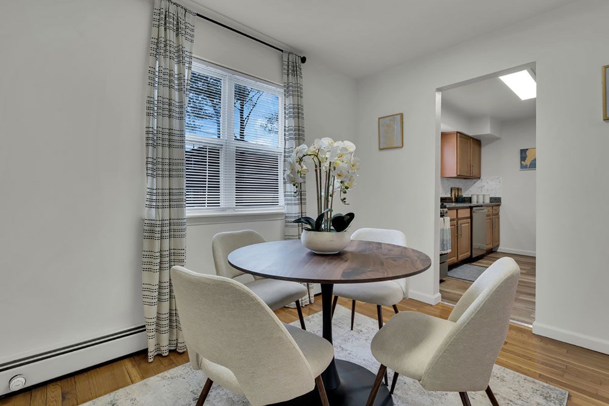 Cloverleaf Gardens photo shows the dining area in a refurbuished apartment with hardwood floors and a table for 4 with an area rug underneath. There is a window to allow for natural light. The kitchen can be seen in the background.
