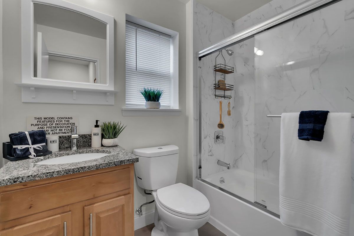 Cloverleaf Gardens photo shows the bathroom in a refurbished apartment with new shower doors and tile, new toilet and vanity with a new medicine cabinet. There is a window to allow for natural light.